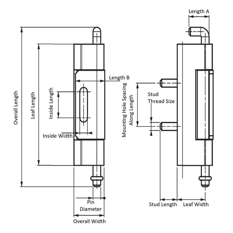 Item Code | Stud Length | Fixed Parts | Length A | Mounting Hole Spacing Along Length | Overall Width | Overall Length | Door to Frame Clearance | Body Material | Hinge Type | Stud Thread Size | Leaf Width | Inside Width | Mounting Method | Removability | Leaf Length | Inside Length | Pin Material | Maximum Rotation | Length B | Request Quote |