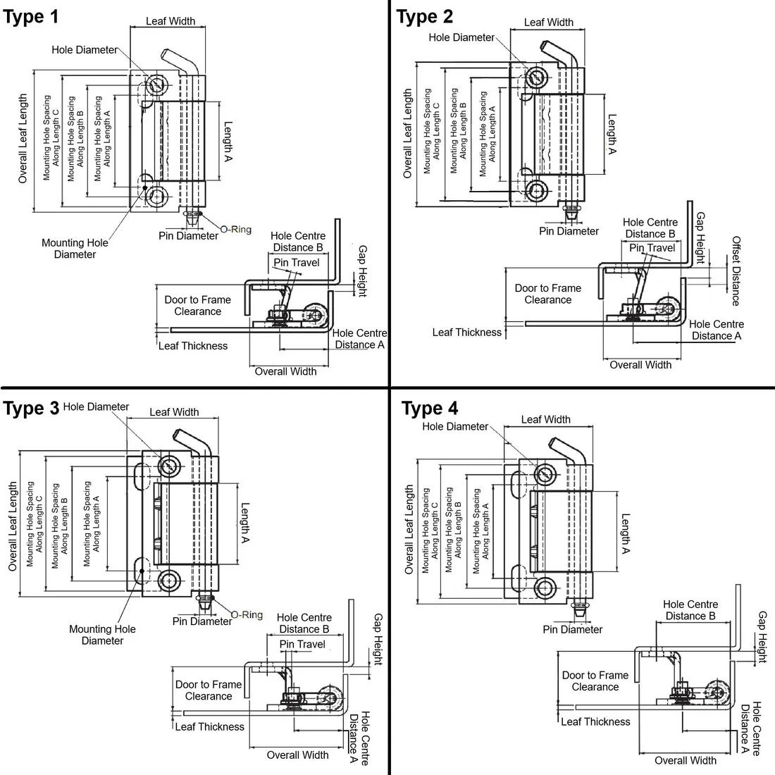 Item Code | Pin Diameter | Length A | Mounting Hole Spacing Along Length B | Material | Overall Width | Door to Frame Clearance | Mounting Hole Spacing Along Length C | Overall Leaf Length | Leaf Thickness | Hinge Type | Type | Leaf Width | Mounting Method | Removability | Mounting Hole Spacing Along Length A | Maximum Rotation | Mounting Hole Diameter | Offset Distance | Request Quote |