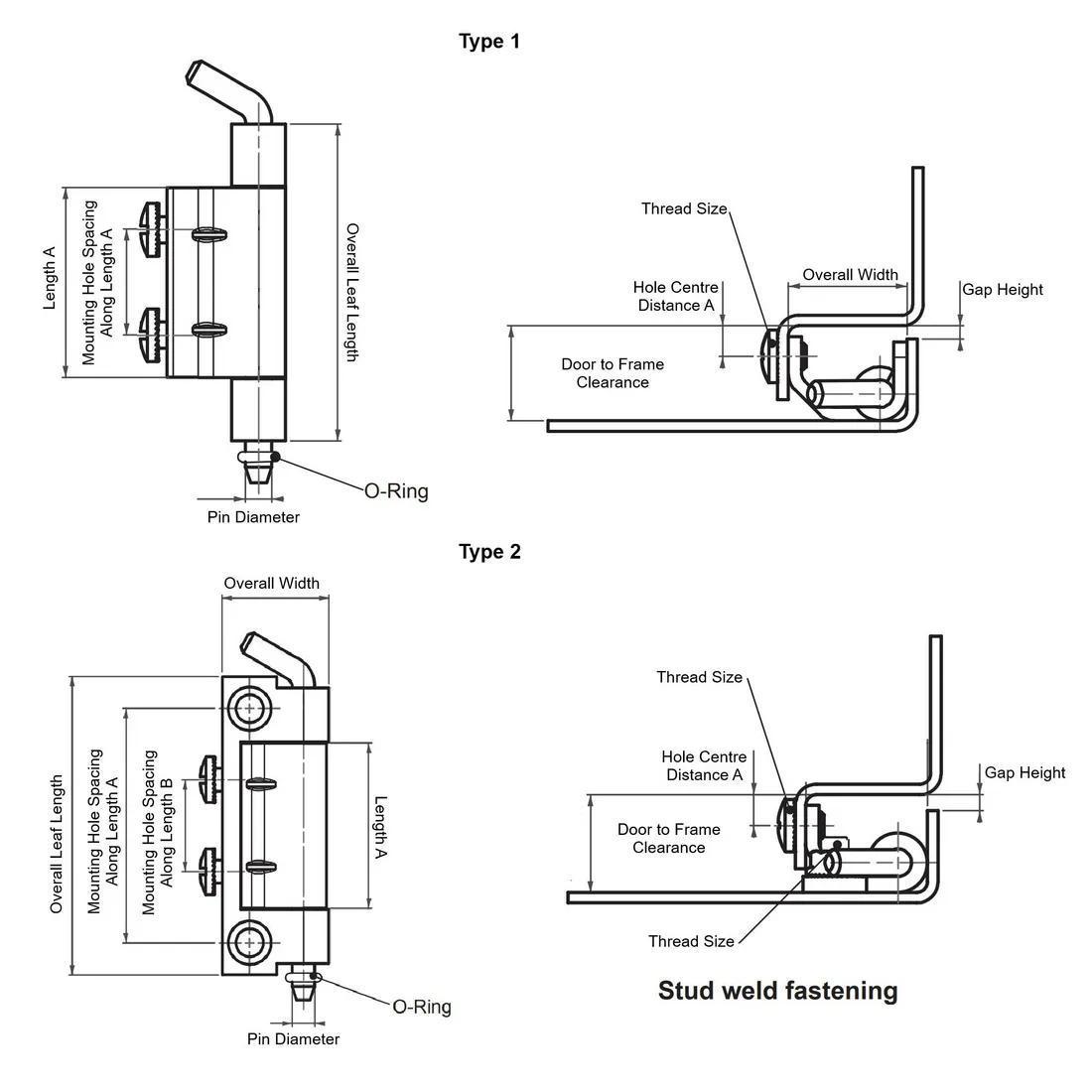 Item Code | Pin Diameter | Length A | Overall Width | Door to Frame Clearance | Hinge Type | Type | Mounting Method | Removability | Thread Size | Material | Welded Part Material | Overall Leaf Length | Mounting Hole Spacing Along Length A | Maximum Rotation | Mounting Hole Spacing Along Length B | Request Quote |