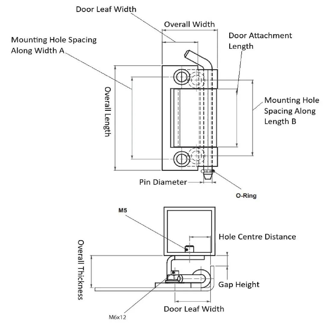 Item Code | Mounting Hole Spacing Along Width A | Mounting Hole Spacing Along Length B | Mounting Orientation | Door Attachment Length | Overall Width | Length to Hole Center | Pin Material | Mounting Hole Shape | Overall Leaf Length | Body Material | Hinge Type | Maximum Rotation | Mounting Method | Removability | Color | Pin Diameter | Thread Size | Material | Overall Length | Door Leaf Width | Overall Thickness | Door to Frame Clearance | Request Quote |