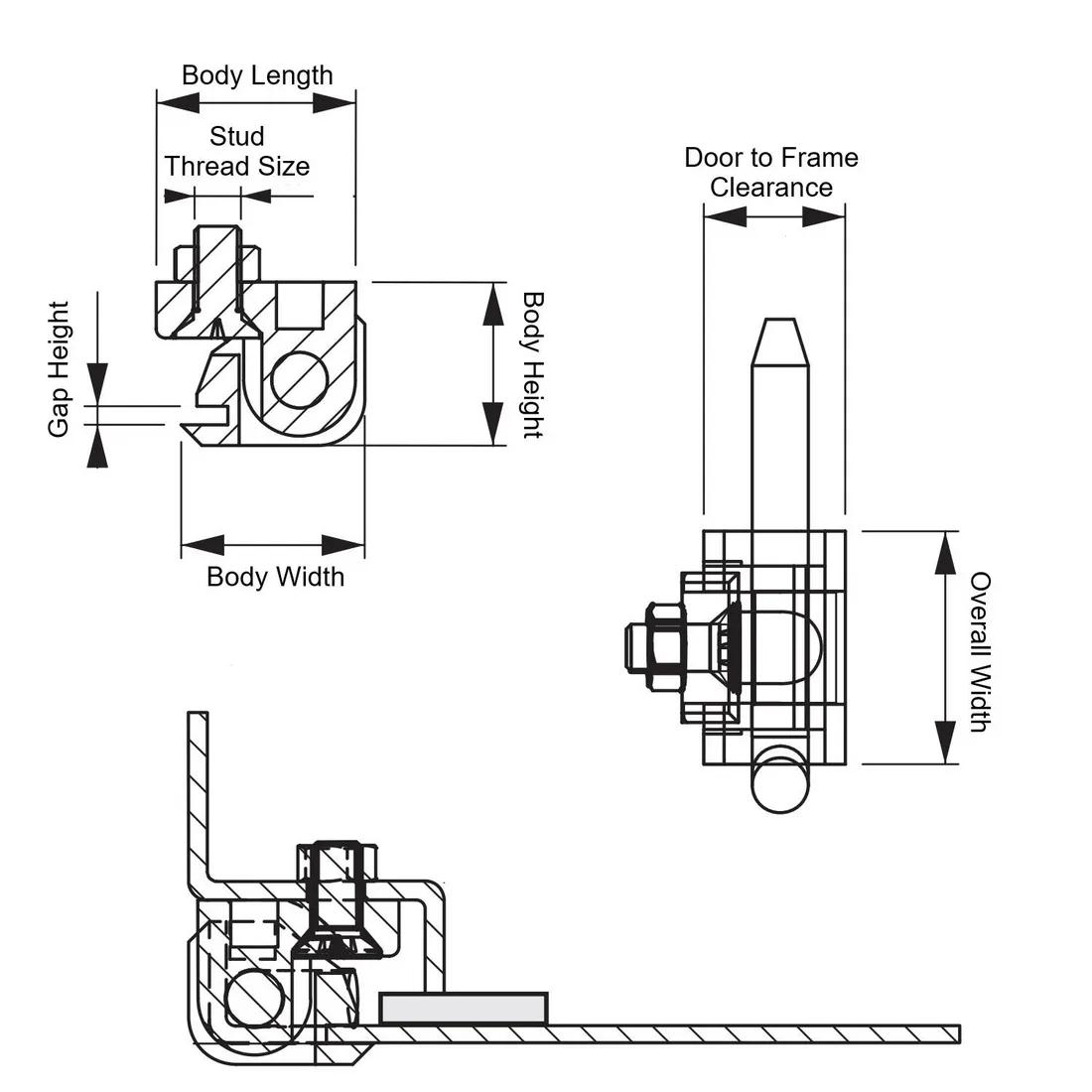 Item Code | Pin Length | Overall Width | Door to Frame Clearance | Pin Material | Body Material | Panel Thickness | Hinge Type | Stud Thread Size | Maximum Rotation | Mounting Method | Removability | Color | Pin Diameter | Request Quote |