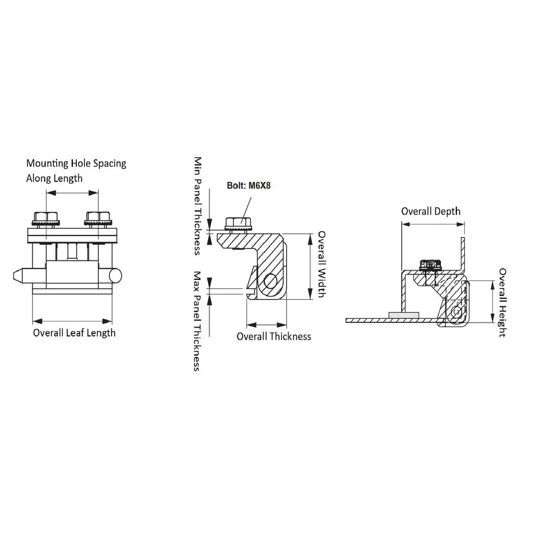 Item Code | Stud Length | Pin Length | Material | Overall Width | Overall Length | Pin Material | Mounting Hole Shape | Body Material | Stud Thread Size | Maximum Rotation | Mounting Method | Removability | Color | Pin Diameter | Mounting Orientation | Mounting Hole Spacing Along Length | Overall Thickness | Door to Frame Clearance | Body Coating | Maximum Panel Thickness | Overall Leaf Length | Finish | Overall Height | Hinge Type | Request Quote |