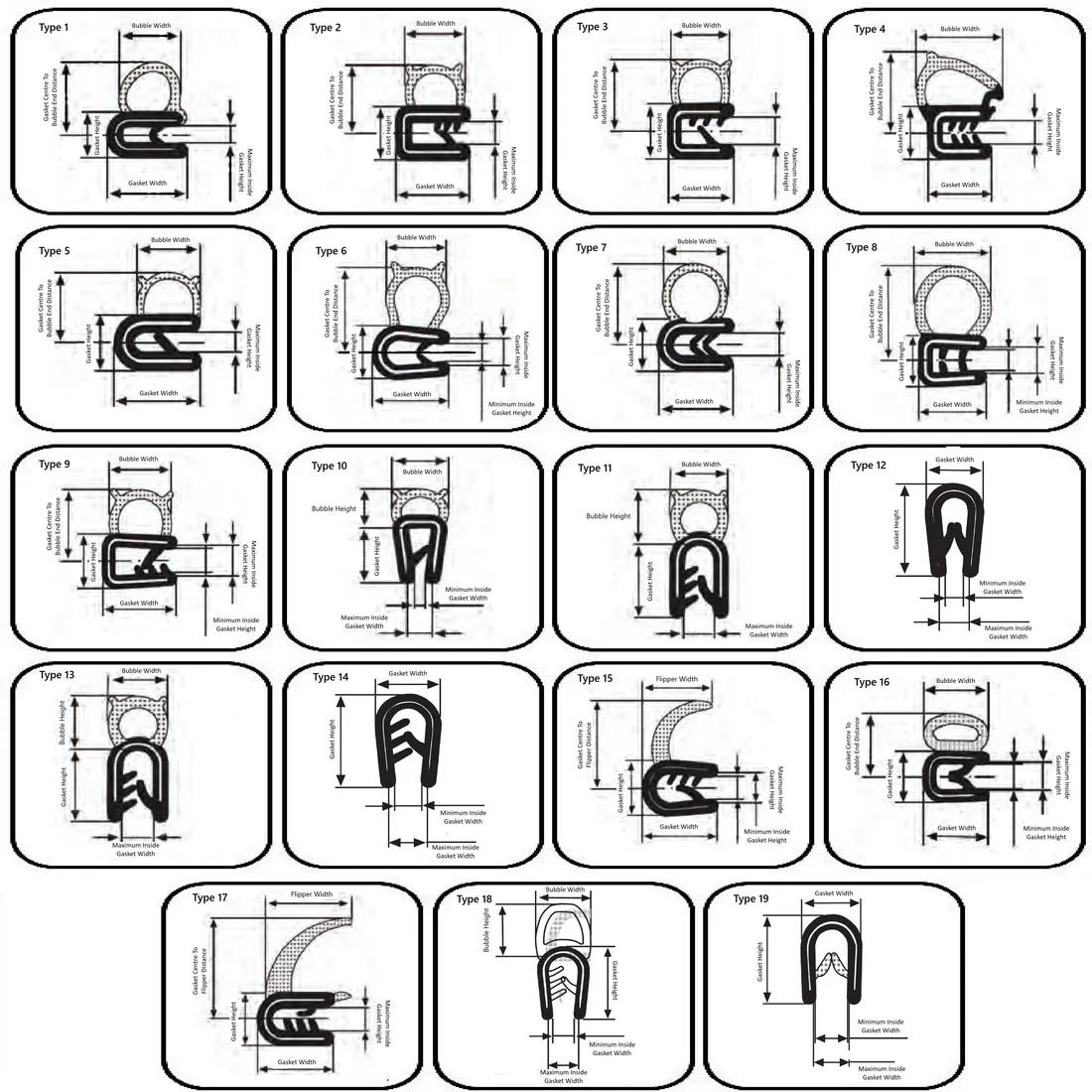 Item Code | Color | Gasket Height | Minimum Grip | Material | Overall Length | Roll Length | Gasket Width | Maximum Inside Gasket Height | Type | Gasket Centre To Bubble End Distance | Bubble Width | Bubble Height | Maximum Inside Gasket Width | Minimum Inside Gasket Width | Minimum Inside Gasket Height | Flipper Width | Gasket Centre To Flipper Distance | Request Quote |