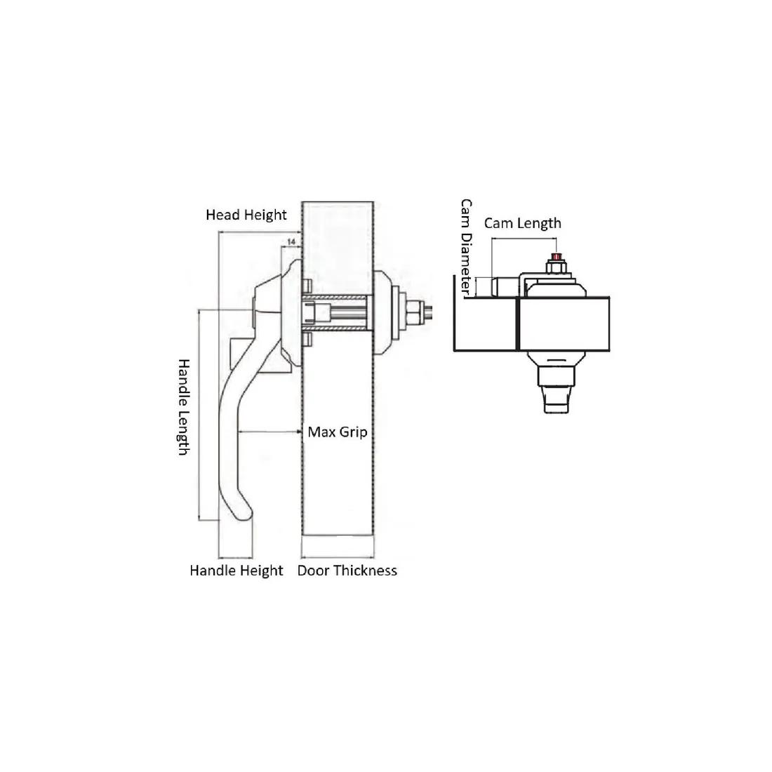 Item Code | Cam Material | Cam Length | Mounting Orientation | Material | Handle Material | Head Height | Key Type | Handle Color | Color | Lock Type | Handle Type | Mounting Hole Width | Maximum Compatible Door Thickness | Latch Style | Type | Handle Length | Handle Height | Cam Diameter | Mounting Hole Length | Request Quote |