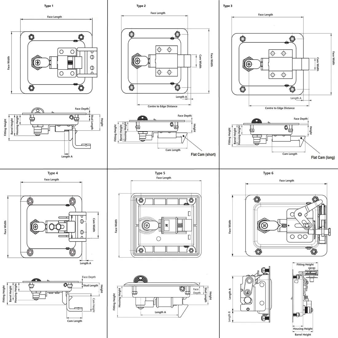 Item Code | Barrel Height | Cam Length | Face Length | Housing Height | Mounting Hole Spacing Along Length | Face Width | Handle Material | Mounting Hole Diameter | Face Depth | Seal Material | Centre to Edge Distance | Type | Fitting Height | Screw Material | Cam Material | Length A | Mounting Hole Spacing Along Width | Cam Width | Body Material | Key Type | Latch Type | Stud Length | Lock Type | Latch Style | Finish | Bracket Material | DIN Pipe Specification | Length B | Cam Height | Request Quote |