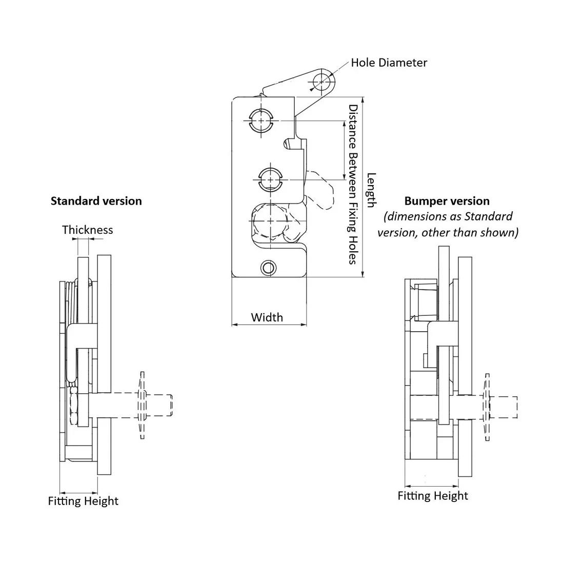Item Code | Mounting Method | Hole Diameter | Distance Between Fixing Holes | Thickness | Latch Type | Finish | Actuation Lever Type | Length | Material | Width | Mounting type | Request Quote |