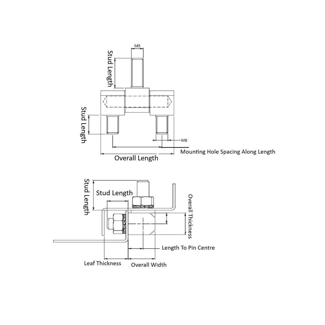 Item Code | Stud Length | Color | Mounting Orientation | Material | Overall Width | Overall Length | Overall Thickness | Pin Material | Finish | Body Material | Leaf Thickness | Mounting Method | Length To Pin Centre | Removability | Body Coating | Mount Style | Screw/Stud Size | Hinge Type | Mounting Hole Spacing Along Length A | Maximum Rotation | Request Quote |