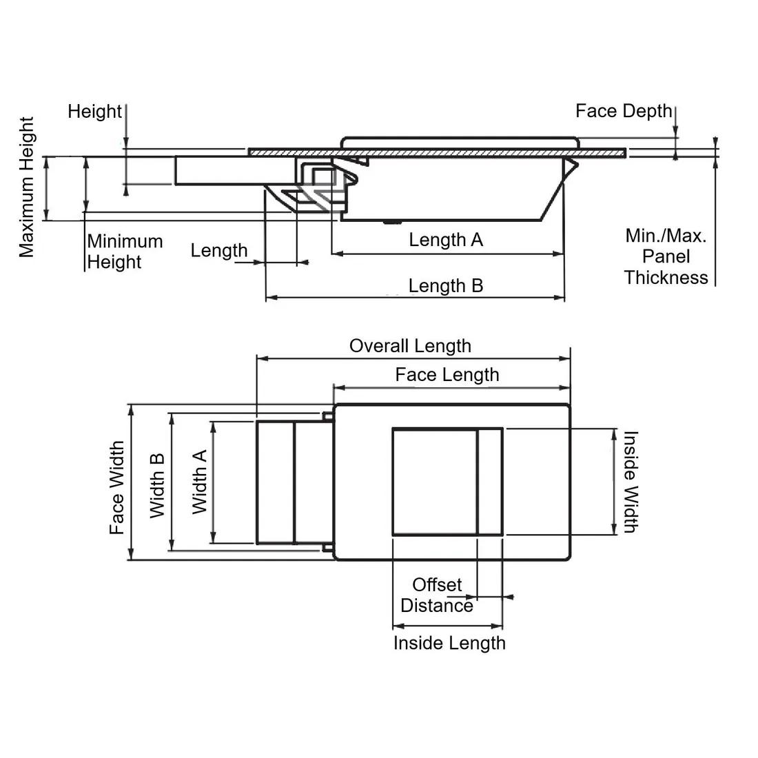 Item Code | Spring Material | Face Width | Overall Length | Maximum Panel Thickness | Body Material | Latch Style | Color | Face Length | Minimum Panel Thickness | Request Quote |