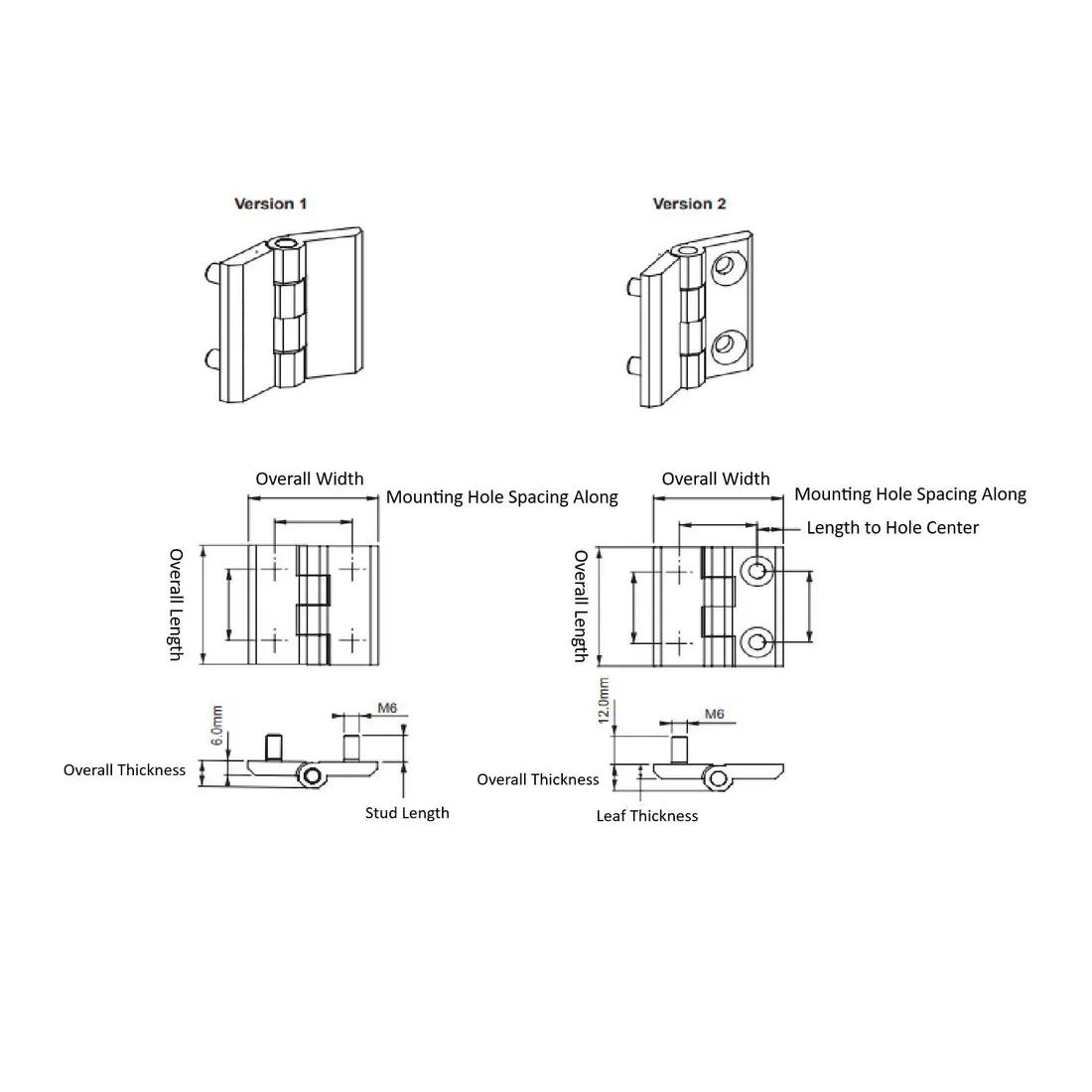 Item Code | Stud Length | Leaf Shape | Color | Mounting Hole Spacing Along Width | Material | Overall Width | Overall Length | Overall Thickness | Pin Material | Finish | Body Material | Leaf Thickness | Hinge Type | Stud Thread Size | Maximum Rotation | Mounting Method | Removability | Mounting Orientation | Mounting Hole Spacing Along Length | Mounting Hole Spacing Along Width A | Length to Hole Center | Mounting Hole Spacing Along Width B | Request Quote |