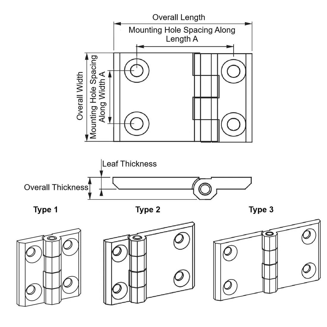 Item Code | Leaf Shape | Color | Mounting Hole Spacing Along Width A | Material | Overall Width | Overall Length | Overall Thickness | Body Coating | Pin Material | Mounting Hole Shape | Finish | Body Material | Leaf Thickness | Hinge Type | Stud Thread Size | Mounting Method | Removability | Mounting Hole Spacing Along Length A | Maximum Rotation | Length to Hole Center | Request Quote |