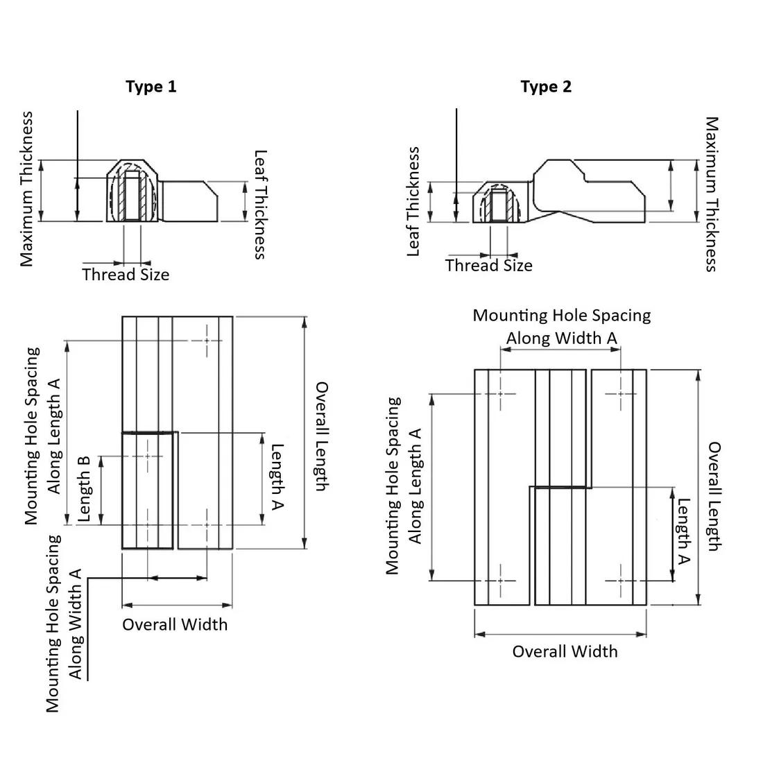 Item Code | Mounting Method | Overall Width | Overall Length | Pin Material | Finish | Leaf Thickness | Hinge Type | Maximum Thickness | Type | Length A | Mounting Hole Spacing Along Width A | Thread Size | Material | Mounting Hole Spacing Along Length A | Maximum Rotation | Length B | Minimum Thickness | Request Quote |