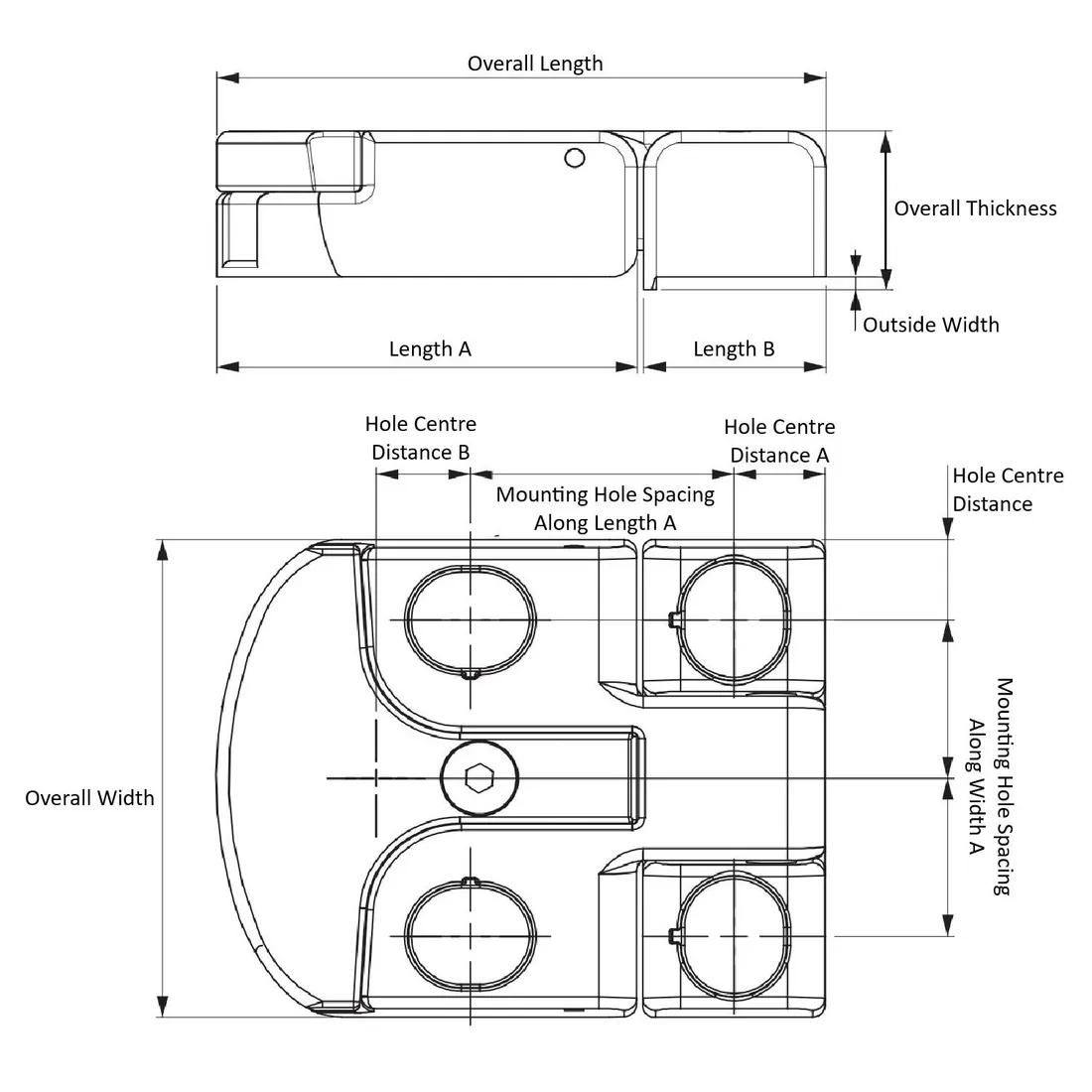 Item Code | Mounting Method | Color | Overall Width | Overall Length | Overall Thickness | Hinge Type | Length A | Mounting Hole Spacing Along Width A | Thread Size | Material | Mounting Hole Spacing Along Length A | Maximum Rotation | Length B | Request Quote |