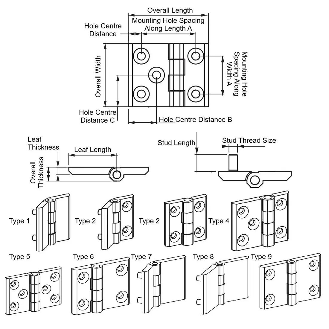 Item Code | Mounting Hole Spacing Along Width A | Overall Width | Overall Length | Overall Thickness | Body Material | Leaf Thickness | Type | Finish | Mounting Hole Spacing Along Length A | Maximum Rotation | Hinge Type | Mounting Method | Removability | Leaf Width | Stud Length | Stud Thread Size | Request Quote |