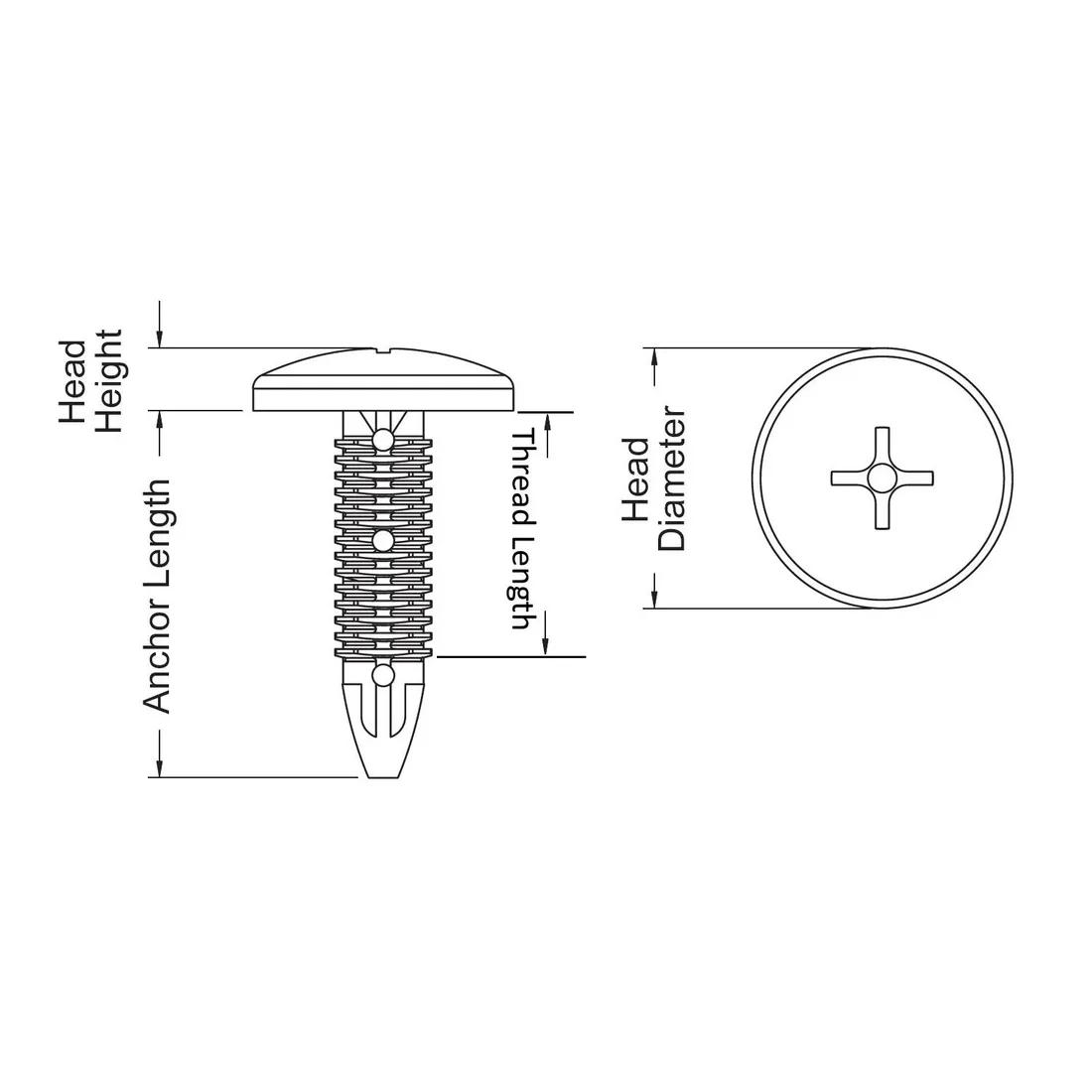 Item Code | Material Flammability Standard | Color | Maximum Hole Diameter | Head Height | Maximum Operating Temperature | Minimum Operating Temperature | Material | UL/CSA Description | Anchor Length | Maximum Panel Thickness | Head Diameter | Request Quote |