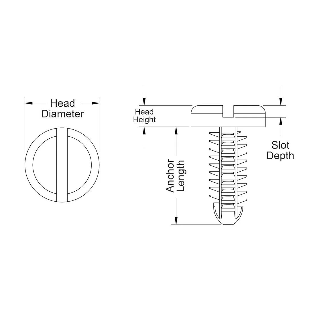 Item Code | Slot Depth | Color | Material | Head Diameter | Head Height | Overall Height | Material Flammability Standard | Screw Size | UL/CSA Description | Anchor Length | Maximum Hole Diameter | Maximum Operating Temperature | Minimum Operating Temperature | Maximum Panel Thickness | Minimum Panel Thickness | Request Quote |