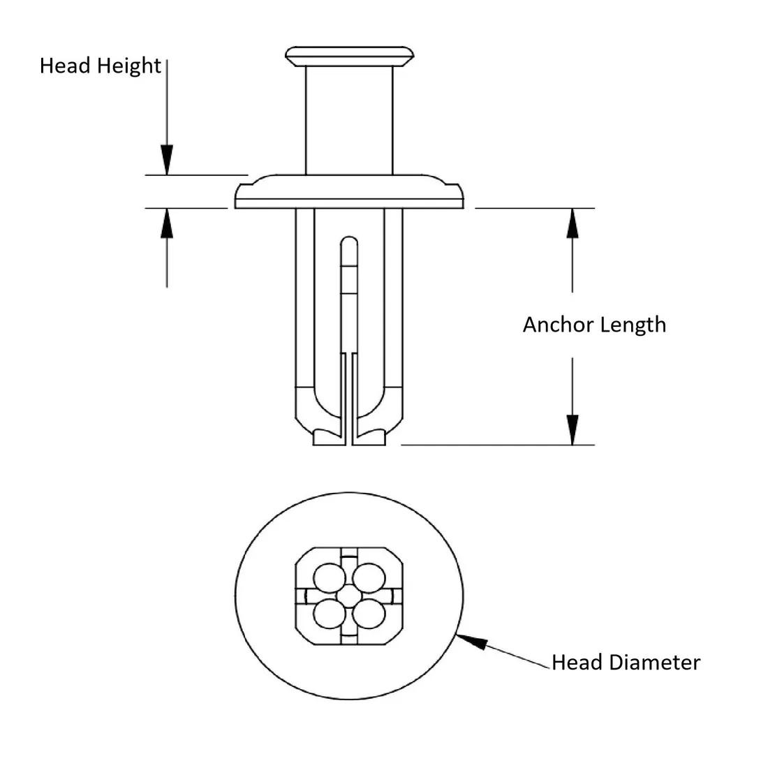 Item Code | Material Flammability Standard | Color | Material | Anchor Length | Head Diameter | Head Height | Panel Thickness | Maximum Operating Temperature | Minimum Operating Temperature | Request Quote |