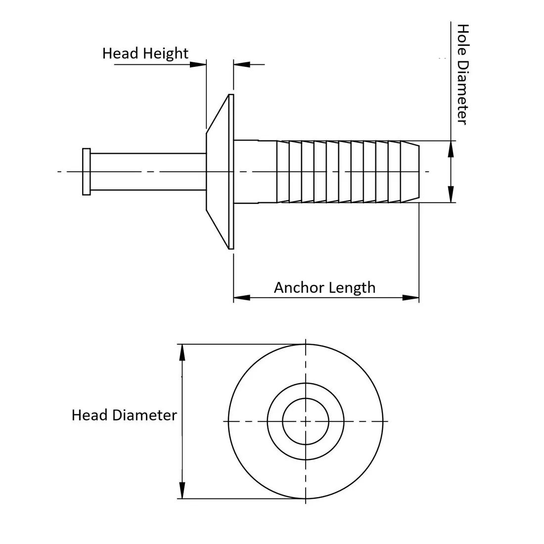 Item Code | Color | Hole Diameter | Anchor Length | Head Diameter | Head Height | Pin Material | Request Quote |