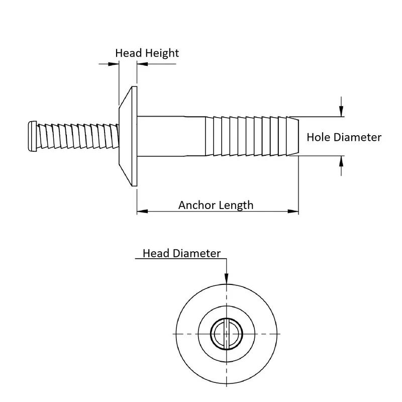 Item Code | Color | Hole Diameter | Anchor Length | Head Diameter | Head Height | Pin Material | Minimum Operating Temperature | Maximum Operating Temperature | Request Quote |