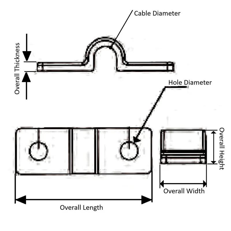 Item Code | Color | Hole Diameter | Material | Overall Length | Overall Thickness | Cable Diameter | Overall Height | Overall Width | Distance Between Fixing Holes | Request Quote |