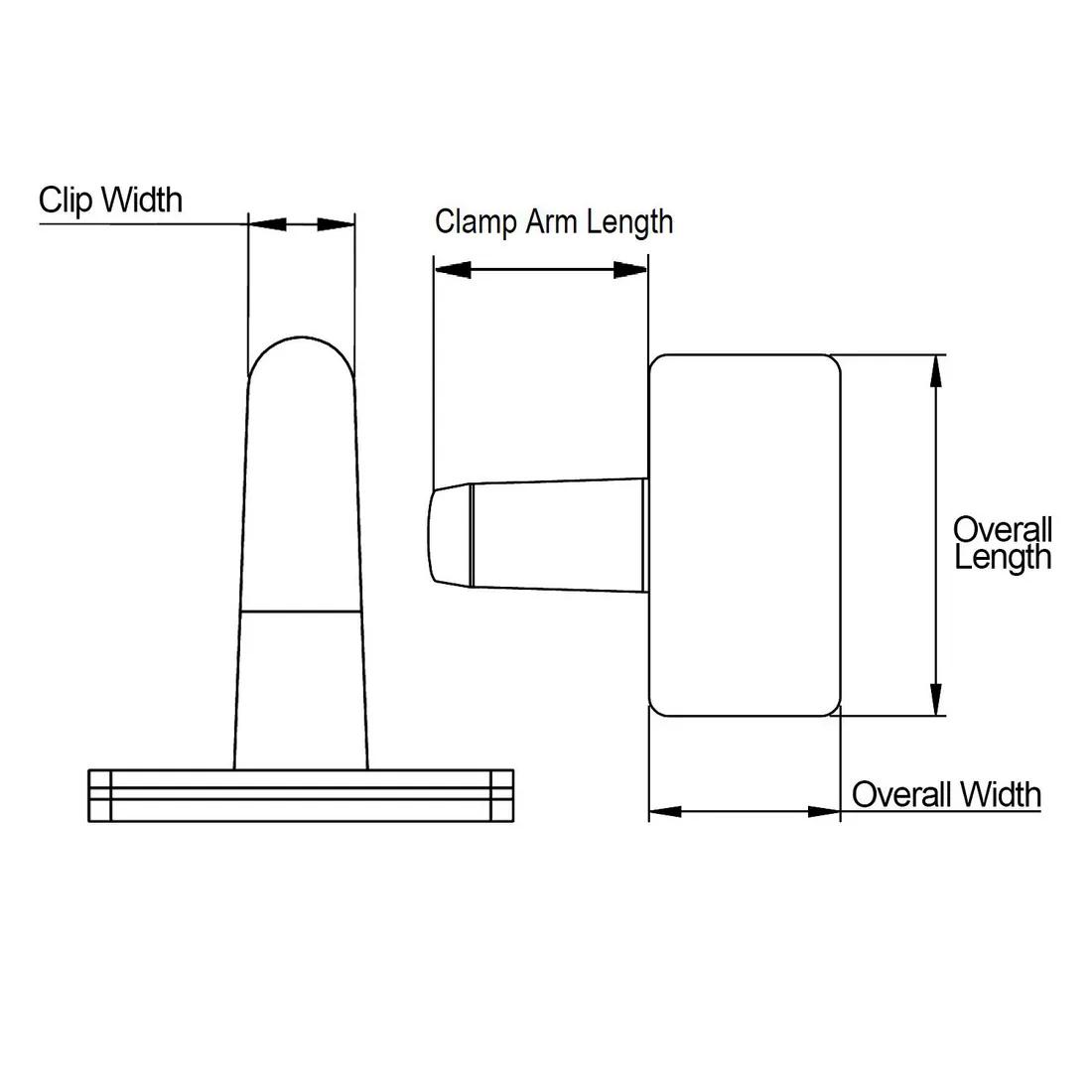 Item Code | Mounting Method | Color | Material Thickness | Material | Overall Width | Overall Length | Base Width | Adhesive Material | Coating | Clamp Arm Length | Clip Width | Clamp Arm Base Length | Adhesive Tape Thickness | Tip Length | Base Length | Request Quote |