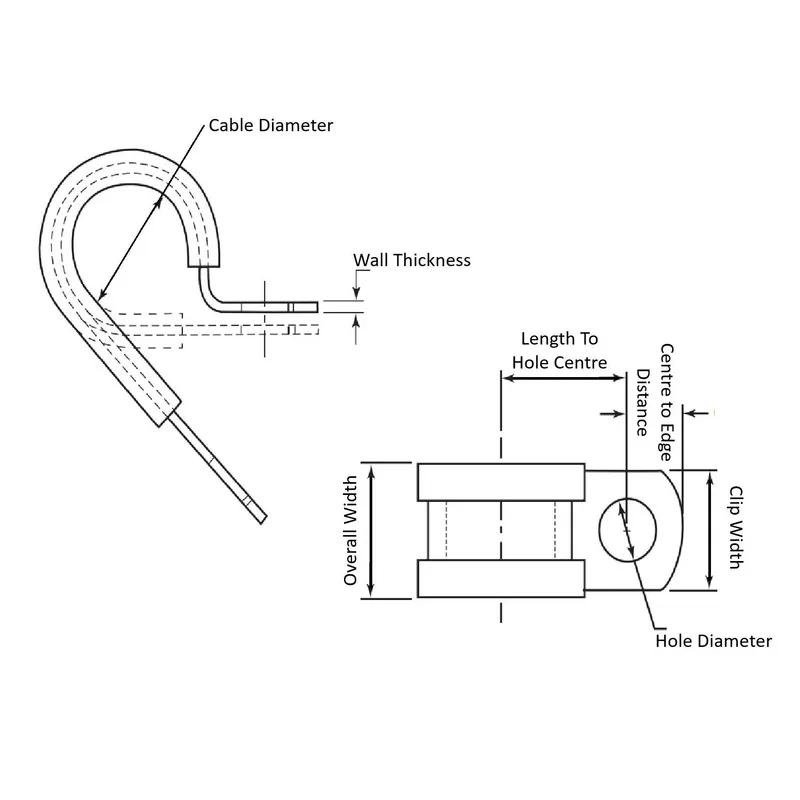 Item Code | Mounting Method | Color | Wall Thickness | Hole Diameter | Overall Width | Length to Hole Center | Maximum Compatible Cable Diameter | Coating | Cable Diameter | Centre to Edge Distance | Maximum Operating Temperature | Clip Width | Minimum Operating Temperature | Material | Request Quote |