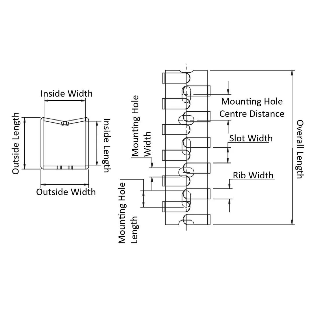 Item Code | Color | Inside Height | Material | Rib Width | Mounting Hole Width | Inside Length | Mounting Hole Center Distance | Square Size | Overall Height | Mounting Hole Length | Inside Width | Material Flammability Standard | Mounting Method | Adhesive Type | Overall Width | Slot Width | Overall Length | UL/CSA Description | Request Quote |