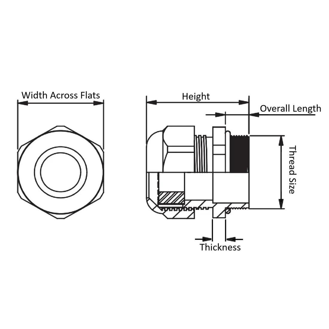 Item Code | Material Flammability Standard | Color | Thread Type | Thickness | Minimum Overall Length | Maximum Operating Temperature | Maximum Overall Length | Width Across Flats | Minimum Operating Temperature | Thread Size | Material | Minimum Compatible Cable Diameter | O-Ring Material | Sealing Gland Material | Overall Length | Mounting Hole Diameter | Maximum Compatible Cable Diameter | Request Quote |