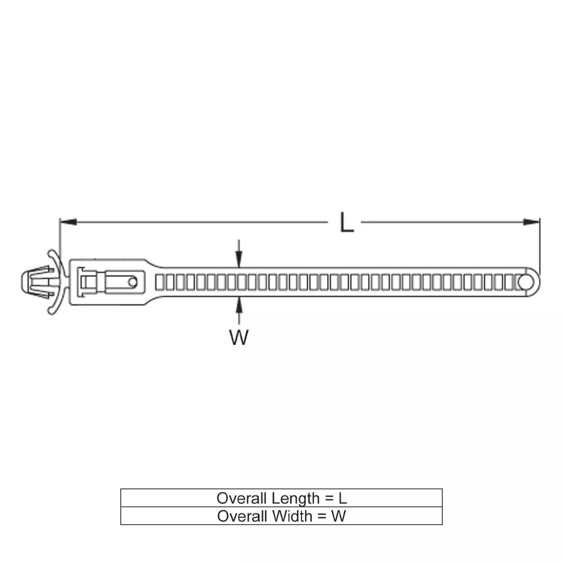 Item Code | Maximum Cable Bundle Diameter | Color | Maximum Service Temperature | Minimum Loop Tensile Strength | Overall Width | Overall Length | Maximum Panel Thickness | Mounting Hole Diameter | Hole Type | Strap Width | Compatible Hole Diameter | Material Flammability Standard | Mounting Method | Material | Maximum Operating Temperature | Head Type | Minimum Operating Temperature | Request Quote |