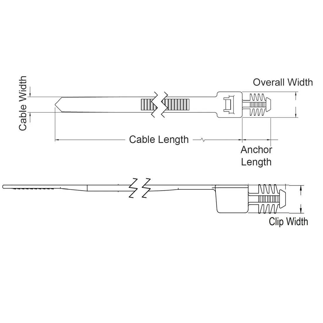 Item Code | Maximum Cable Bundle Diameter | Color | Overall Width | Mounting Hole Diameter | Hole Type | Cable Diameter | Panel Thickness | Cable Width | Maximum Operating Temperature | Compatible Hole Diameter | Material Flammability Standard | Mounting Method | Minimum Operating Temperature | Material | Minimum Loop Tensile Strength | Overall Length | UL/CSA Description | Anchor Length | Maximum Panel Thickness | Cable Length | Strap Width | Minimum Panel Thickness | Clip Width | Strap Thickness | Clip Height | Request Quote |