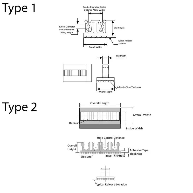 Item Code | Adhesive Tape Thickness | Base Thickness | Material | Overall Width | Overall Length | Head Inside Diameter | Hole Centre Distance | Overall Height | Inside Width | Material Flammability Standard | Mounting Method | Color | Number of Slots | Radius | Overall Depth | Bundle Diameter Centre Distance Along Width | Clip Depth | Clip Height | Bundle Diameter Centre Distance Along Height | Base Width | Base Length | Request Quote |