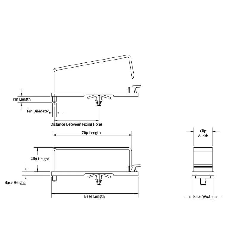 Item Code | Compatible Hole Size | Color | Material | Distance Between Fixing Holes | Maximum Panel Thickness | Base Width | Mounting Hole Diameter | Base Height | Clip Height | Clip Width | Material Flammability Standard | Mounting Method | Base Length | Minimum Panel Thickness | Request Quote |