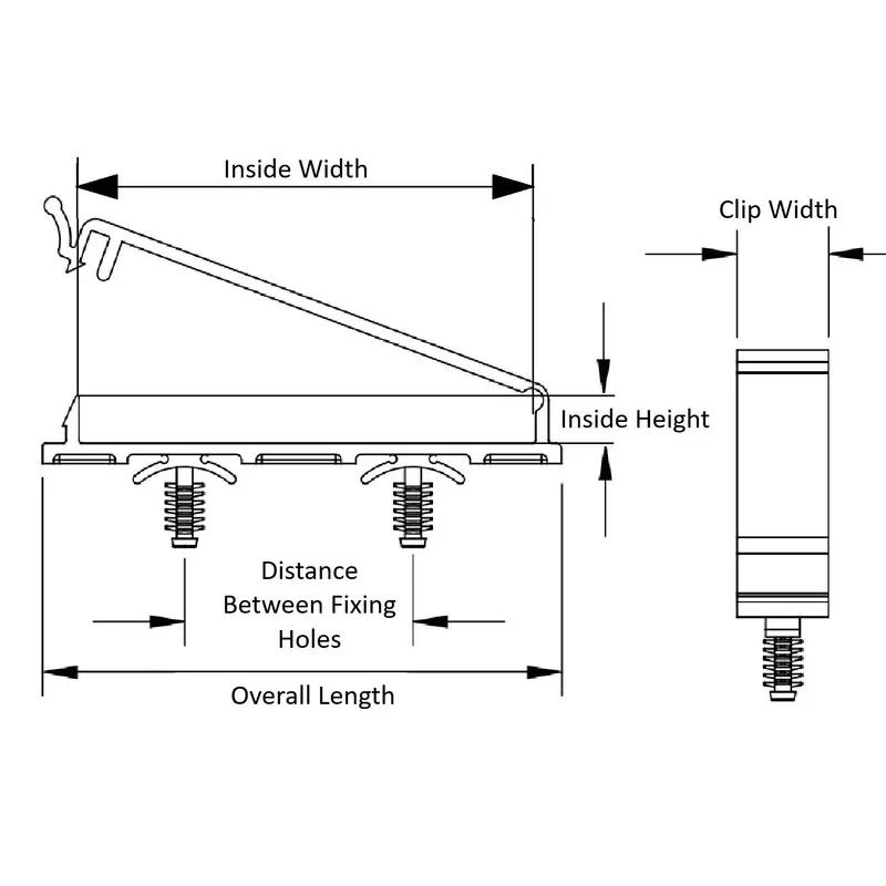 Item Code | Compatible Hole Size | Color | Inside Height | Material | Distance Between Fixing Holes | Overall Length | Maximum Panel Thickness | Mounting Hole Diameter | Clip Width | Inside Width | Material Flammability Standard | Mounting Method | Base Length | Minimum Panel Thickness | Request Quote |