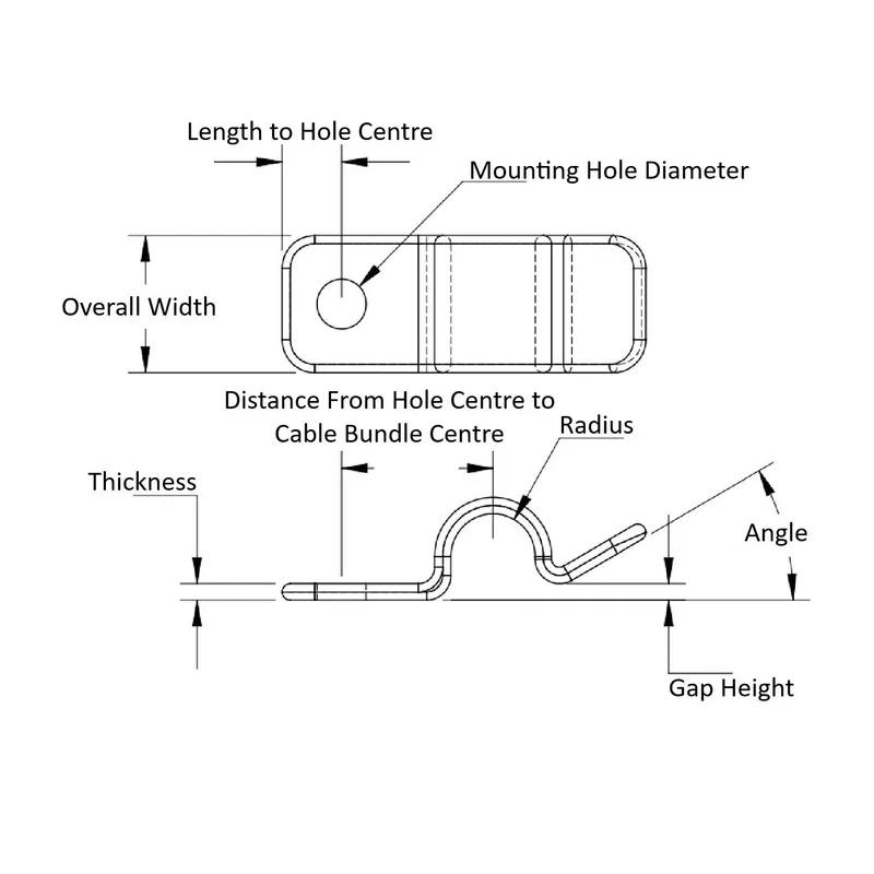 Item Code | Distance From Hole Centre to Cable Bundle Centre | Gap Height | Hole Diameter | Material | Overall Width | Cable Diameter | Material Flammability Standard | Screw Size | Color | Radius | Length to Hole Center | Angle | Request Quote |