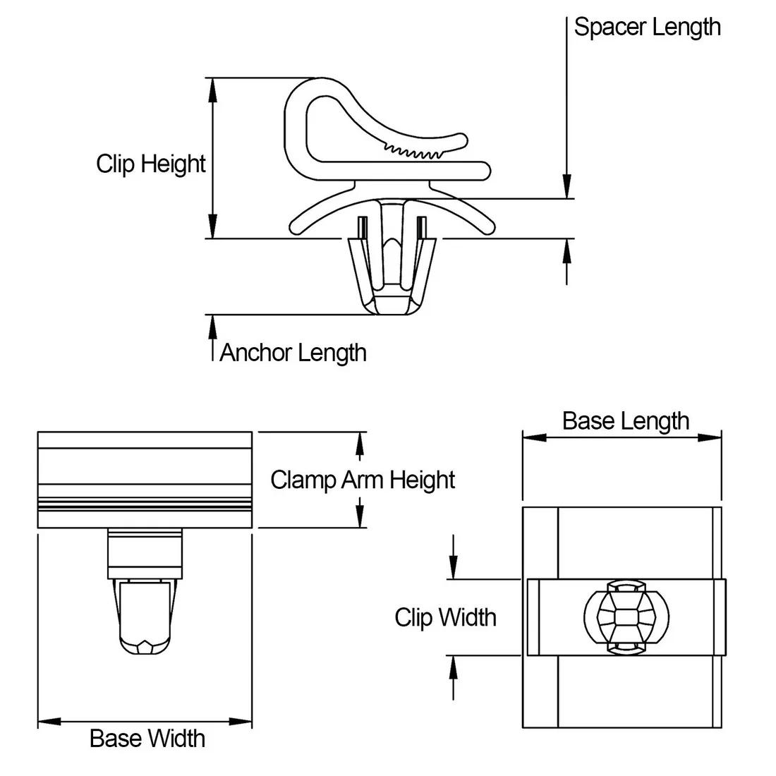 Item Code | Mounting Method | Overall Width | Maximum Panel Thickness | Base Width | Mounting Hole Diameter | Maximum Operating Temperature | Clip Width | Gap Height | Compatible Hole Size | Color | Standoff Height | Minimum Operating Temperature | Material | Overall Length | UL/CSA Description | Base Length | Minimum Panel Thickness | Overall Height | Clip Height | Request Quote |