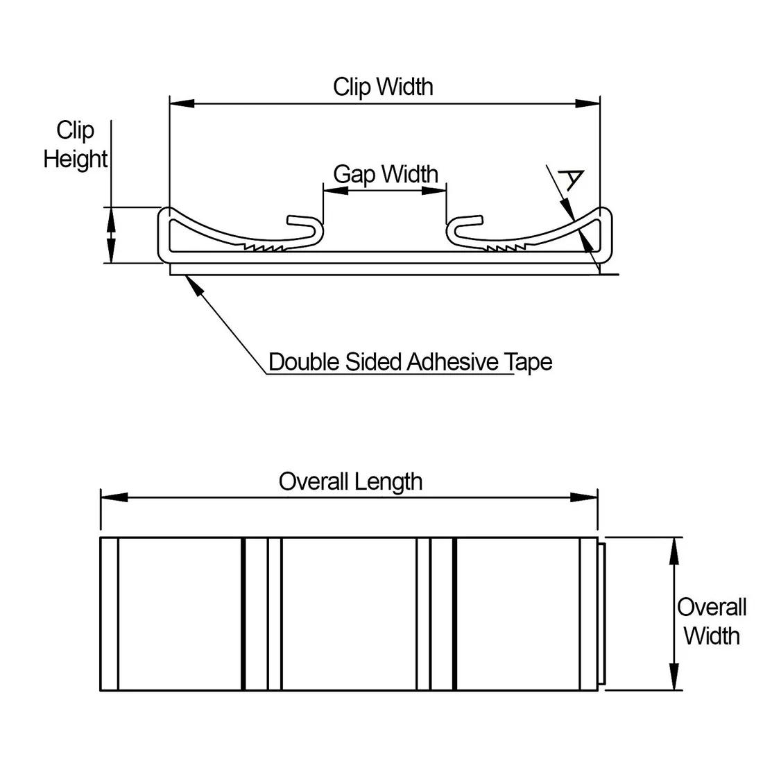 Item Code | Overall Thickness | Adhesive Material | Inside Length | Gap Width | Inside Width | Material Flammability Standard | Mounting Method | Maximum Wall Thickness | Color | Minimum Operating Temperature | Material | Adhesive Type | Overall Width | Overall Length | UL/CSA Description | Base Length | Overall Height | Clip Height | Maximum Operating Temperature | Maximum Wall Thickness | Clip Width | Type | Request Quote |