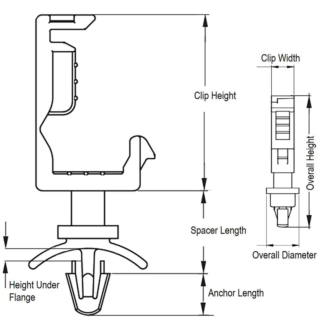 Item Code | Inside Width | Maximum Cable Bundle Diameter | Color | Inside Height | Mounting Hole Diameter | Clip Depth | Locking Head Height | Height Under Flange | Material | Overall Diameter | Minimum Cable Bundle Diameter | Overall Width | Spacer Length | UL/CSA Description | Anchor Length | Maximum Panel Thickness | Flange Diameter | Minimum Panel Thickness | Overall Height | Cable Width | Clip Height | Clip Width | Type | Request Quote |