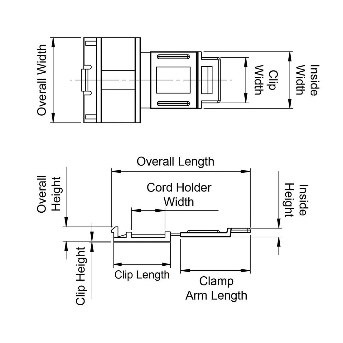 Item Code | Adhesive Tape Thickness | Color | Inside Height | Accessory Type | Overall Width | Cord Holder Width | Base Width | Adhesive Material | Cable Diameter | Maximum Operating Temperature | Clip Width | Inside Width | Material Flammability Standard | Mounting Method | Minimum Operating Temperature | Material | Overall Length | UL/CSA Description | Base Length | Overall Height | Clamp Arm Length | Clip Height | Request Quote |