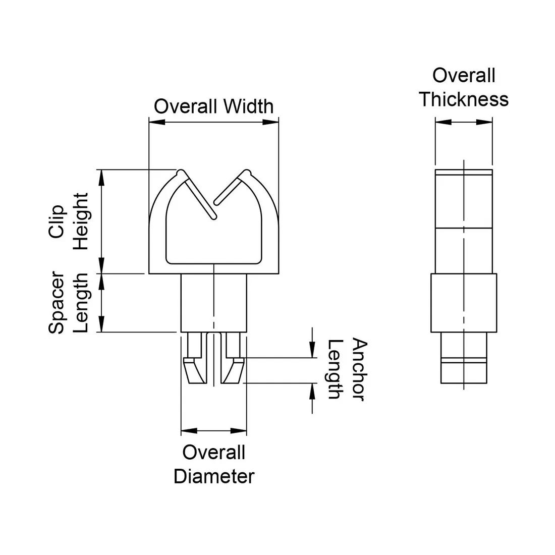 Item Code | Color | Inside Height | Overall Thickness | Maximum Panel Thickness | Mounting Hole Diameter | Fitting Style | Style | Locking Head Height | Panel Thickness | Clip Height | Maximum Operating Temperature | Compatible Hole Diameter | Inside Width | Material Flammability Standard | Saddle Type | Minimum Operating Temperature | Material | Overall Diameter | Overall Width | Spacer Length | UL/CSA Description | Anchor Length | Spacer Diameter | Clip Depth | Clip Width | Type | Request Quote |
