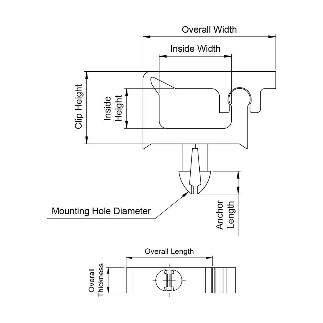 Item Code | Color | Inside Height | Overall Width | Overall Thickness | Maximum Panel Thickness | Mounting Hole Diameter | Fitting Style | Clip Depth | Locking Head Height | Panel Thickness | Clip Height | Maximum Operating Temperature | Compatible Hole Diameter | Inside Width | Material Flammability Standard | Saddle Type | Minimum Operating Temperature | Material | Overall Length | UL/CSA Description | Anchor Length | Clip Width | Type | Request Quote |
