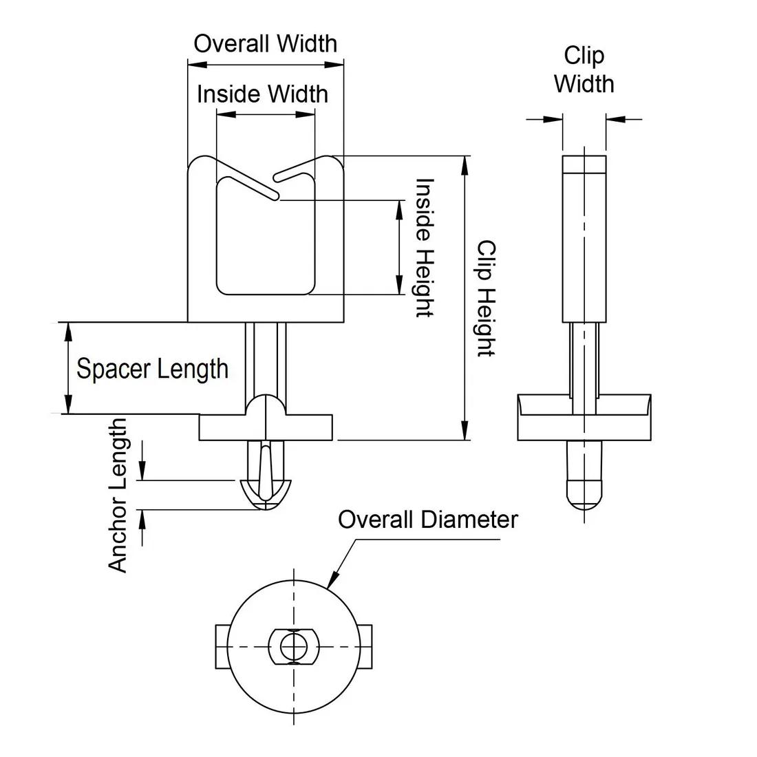 Item Code | Color | Inside Height | Mounting Hole Diameter | Fitting Style | Clip Depth | Locking Head Height | Panel Thickness | Clip Height | Maximum Operating Temperature | Compatible Hole Diameter | Inside Width | Material Flammability Standard | Saddle Type | Minimum Operating Temperature | Material | Overall Diameter | Overall Width | Spacer Length | UL/CSA Description | Anchor Length | Maximum Panel Thickness | Flange Diameter | Style | Height Above the Flange | Cable Diameter | Clip Width | Type | Request Quote |
