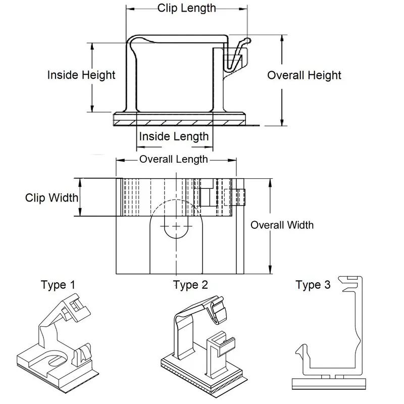 Item Code | Color | Inside Height | Overall Width | Mounting Hole Diameter | Adhesive Material | Inside Length | Base Height | Overall Height | Maximum Operating Temperature | Mount Type | Inside Width | Material Flammability Standard | Minimum Operating Temperature | Material | Overall Length | UL/CSA Description | Length to Hole Center | Base Width | Minimum Inside Diameter | Base Length | Clip Width | Type | Hole Diameter | Screw Size | Thread Size | Request Quote |