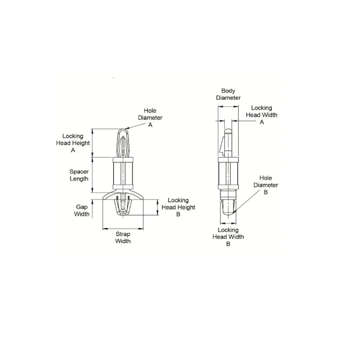 Item Code | Minimum Panel Thickness A | Material Flammability Standard | Hole A Fix Type | Body Diameter | Hole Diameter A | Spacer Length | UL/CSA Description | Hole B Fix Type | Locking Head Height B | Locking Head Height A | Type | Hole Diameter B | Color | Minimum Operating Temperature | Material | Strap Width | Style | Maximum Panel Thickness B | Minimum Panel Thickness B | Maximum Panel Thickness A | Maximum Operating Temperature | Locking Head Width B | Gap Width | Locking Head Width A | Exposed End Diameter | Request Quote |