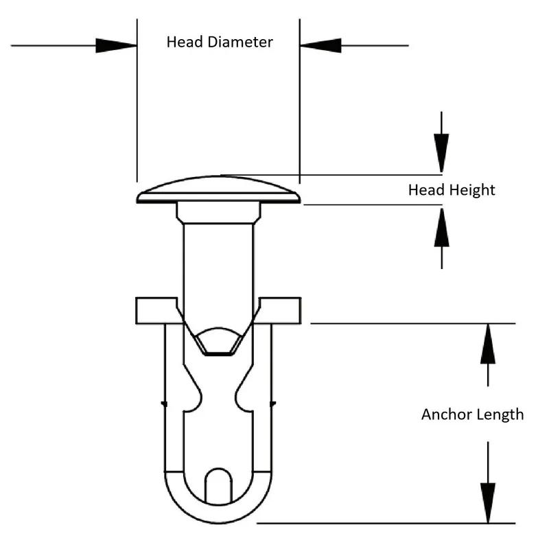 Item Code | Norma de inflamabilidad del material | Color | Diámetro del orificio | Materiales | Longitud del anclaje | Altura de la cabeza | Espesor mínimo del panel | Grosor máximo del panel | Diámetro de la cabeza | Temperatura máxima de funcionamiento | Temperatura mínima de funcionamiento | Altura total | Solicitar cotización |